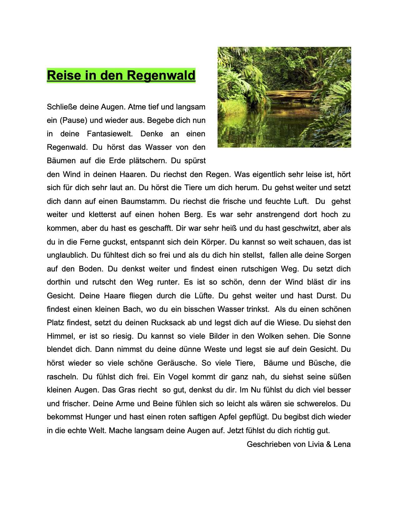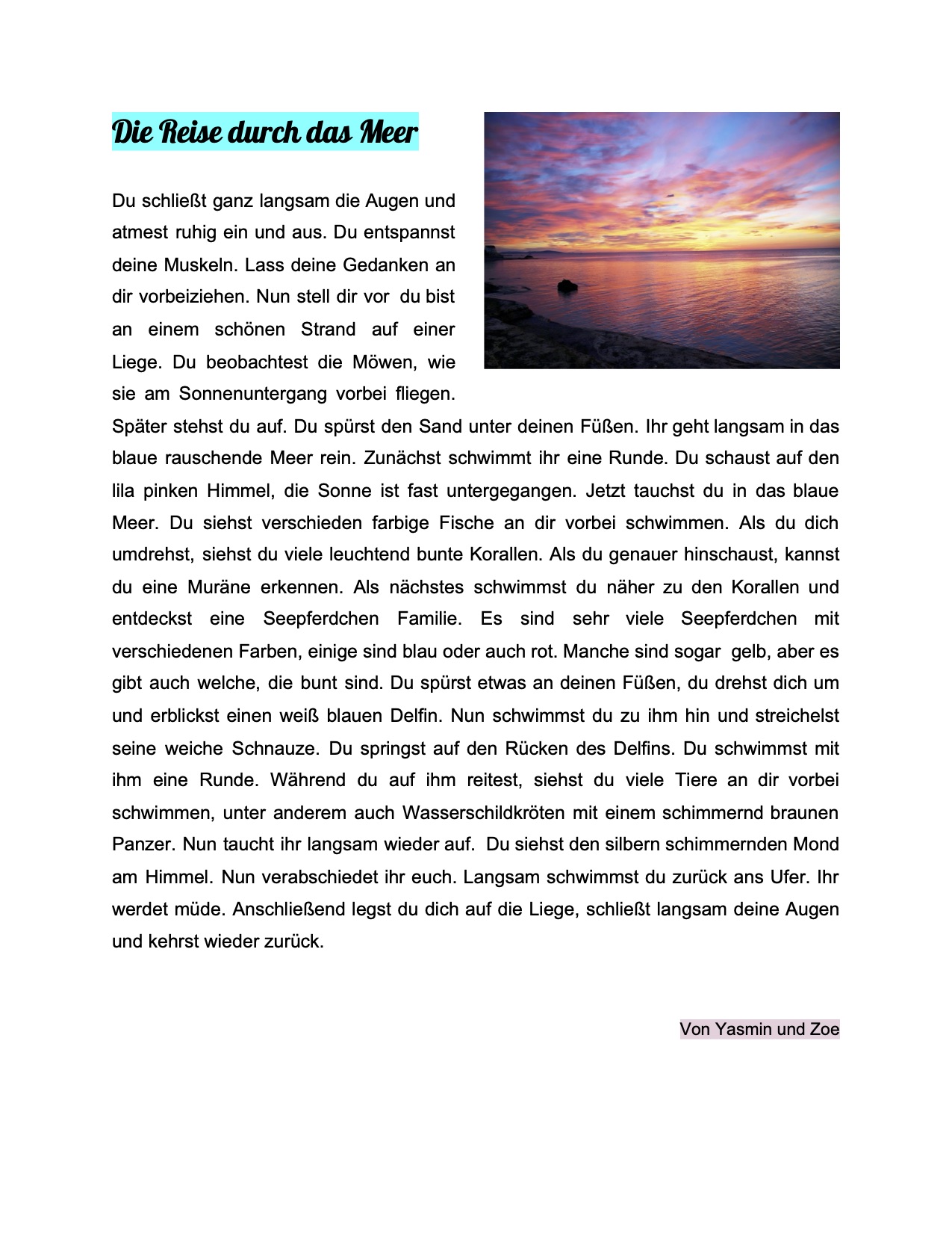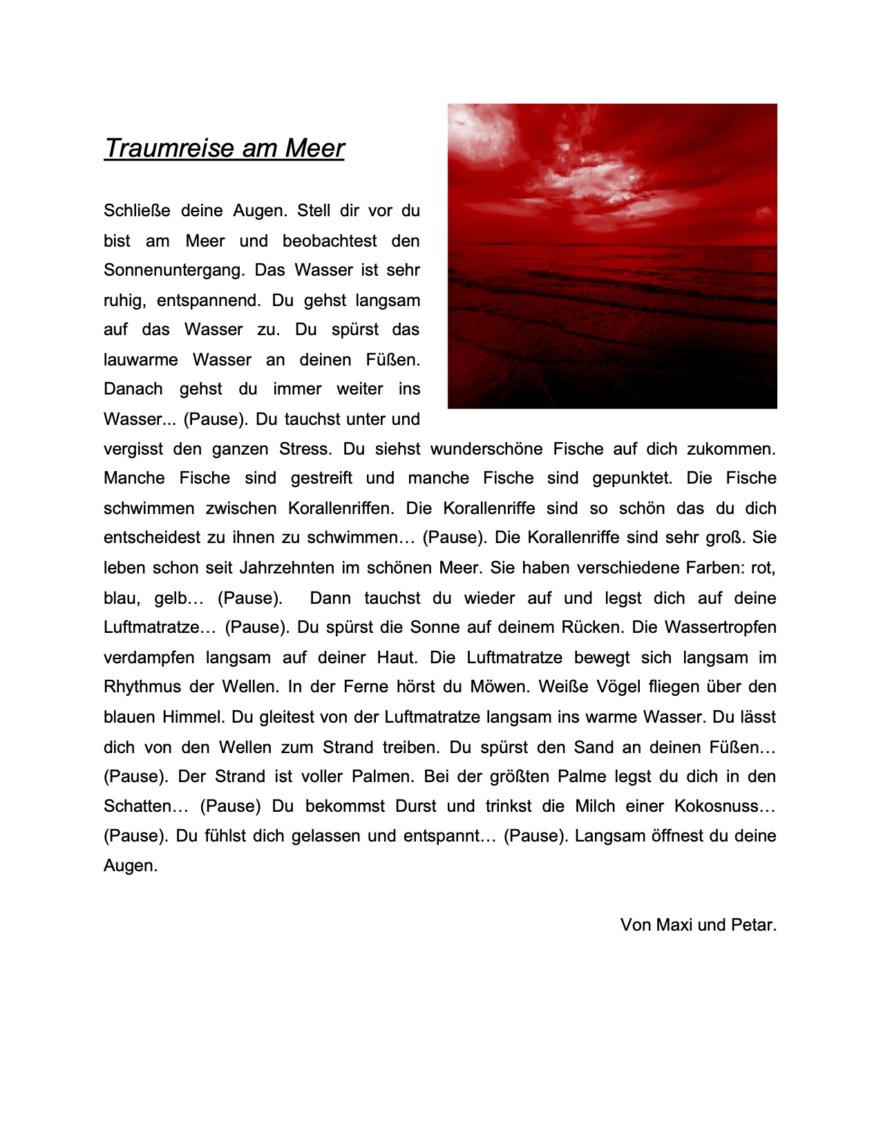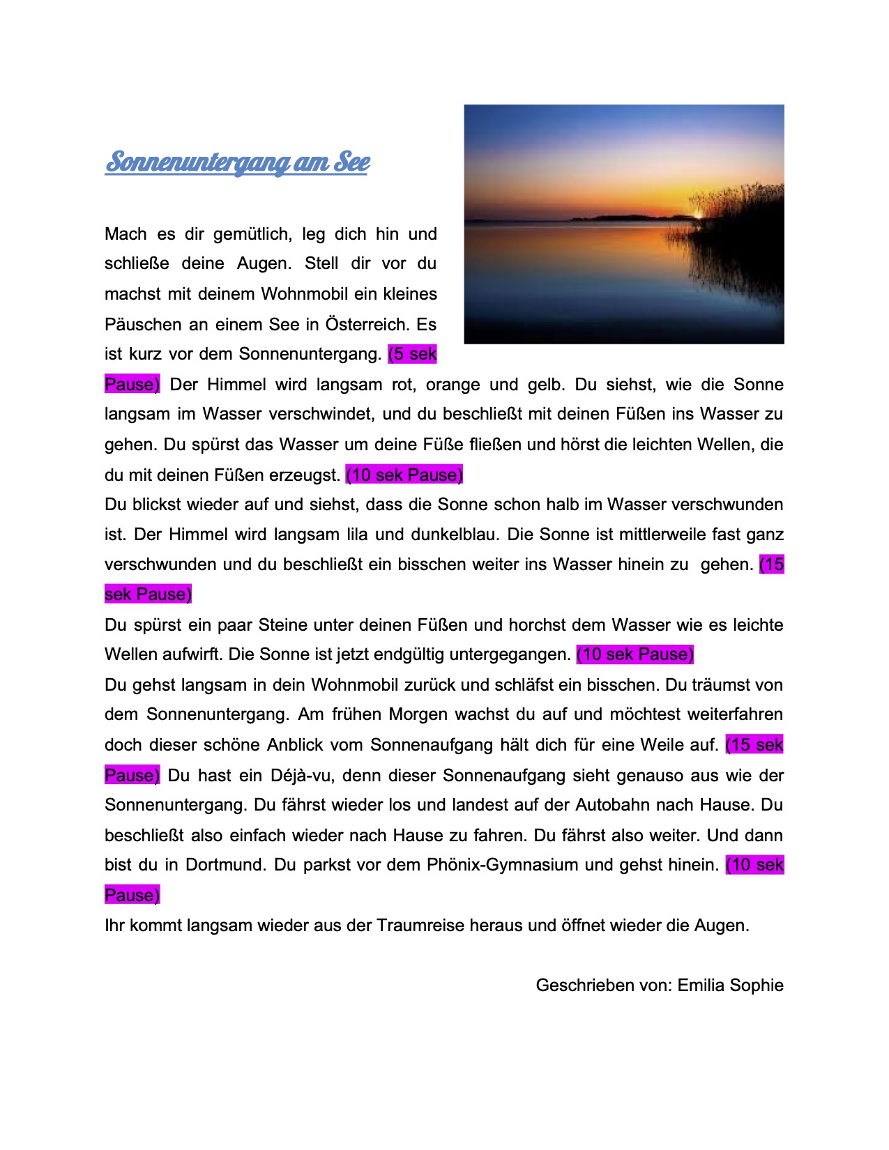 Die Klasse 6c hat sich im Rahmen des Ergänzungsfaches "PhoenExplorer" mit Stress & Entspannung beschäftigt und anschließend eigene Traumreisen geschrieben. Viel Spaß beim Träumen.