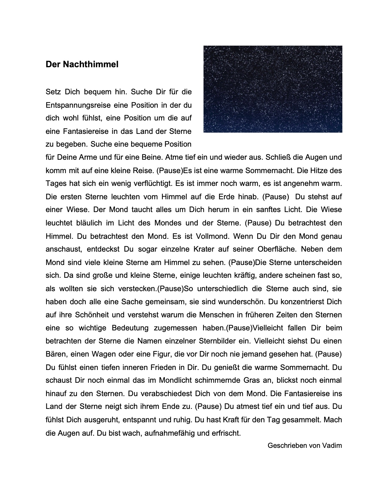 Du schließt ganz langsam die Augen und atmest ruhig ein und aus. Du entspannst deine Muskeln. Lass deine Gedanken an