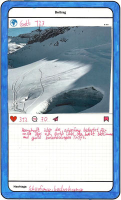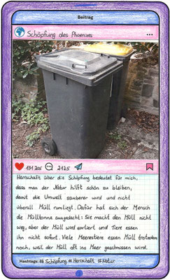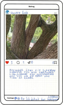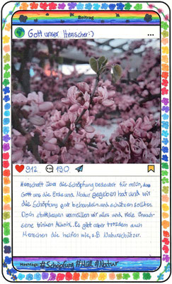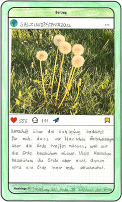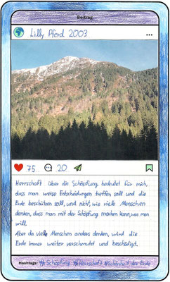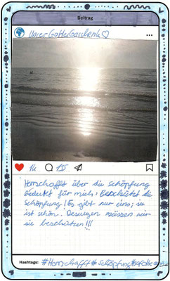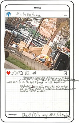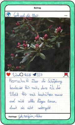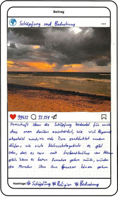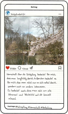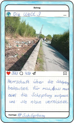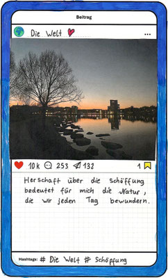 Wir, der Religionskurs der Klasse 5B, haben uns im Unterricht mit dem Herrschaftsauftrag über die Schöpfung in der Bibel beschäftigt. Zu diesem Thema hat uns unser Lehrer, Herr Altmeppen, über sechs Wochen die kreative Langzeit-Hausaufgabe gegeben, dass wir fünf Bilder zum Thema „Schönheit der Schöpfung“ und fünf Bilder zum Thema „Bedrohung der Schöpfung“ fotografieren sollen. Wir haben uns mit dem Buch Genesis beschäftigt und sollten einen Text schreiben, was der Herrschaftsauftrag über die Schöpfung für uns bedeutet. Dazu haben wir ein Foto aus unserer Langzeit-Hausaufgabe ausgewählt und daraus einen Instagram-Beitrag gemacht.