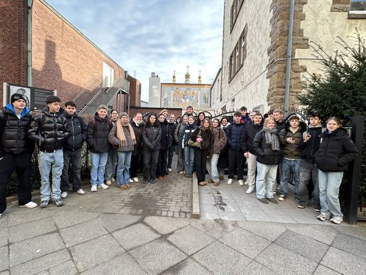 Stationen waren die evangelische Lutherkirche, die seit ihrer Entwidmung im Jahr 2021 als „Studio 41“ firmiert und sich alternativen Angeboten des kirchlichen Lebens widmet (z. B. Gottesdienste für queere Menschen oder musikalisch geprägte Zusammenkünfte), die russisch-orthodoxe Kirche zur Heiligen Dreifaltigkeit, deren Neujahrsgottesdienst für kurze Zeit besucht werden durfte, sowie die Kocatepe-Moschee, deren Religionsbeauftragter für Fragen zur Verfügung stand und diese kompetent und ehrlich beantwortete, sodass die SchülerInnen einen guten Einblick in den Glauben und seine Strukturen gewinnen konnten. Nebenbei diente die Exkursion, dank einer wissensreichen Begleitung - und fachlichen Ergänzungen durch Frau Stock und Herrn Altmeppen - ebenfalls als Nachhilfestunde zur Stadtgeschichte Dortmunds und hat somit abermals ihren Beitrag geleistet.