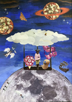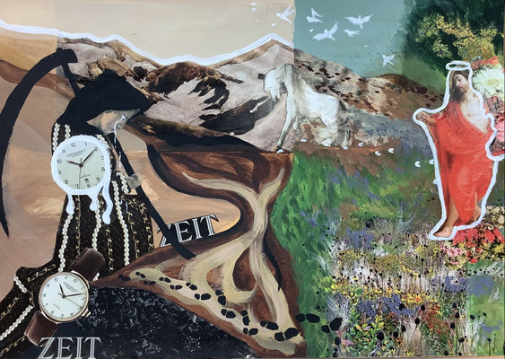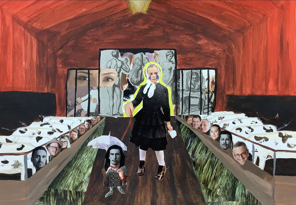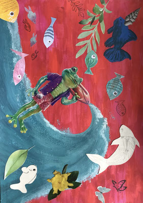 Ausgehend von der Epoche des Dadaismus verfassten die Schüler:innen mithilfe der Methode des Cadavre Exquis Sätze, die sie zu einer surreal anmutenden Mixed-Media-Collage weiterentwickelten. Hier ein paar Beispiele aus der EF unter der Leitung von Kathrin Feuler: