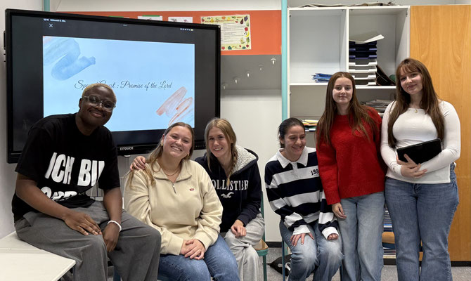 Im katholischen Religionsunterricht der EF von Frau Stock stellten Schüler*innen Präsentationen zum Thema „Spuren vom Religiösen im Alltag“ vor. Die Gruppe von Aurelia, Ciara, Evie, Julia & Zoéy hatte das Thema „Religion in der Musik“; sie wollten dabei herausfinden, wie Glaube, Spiritualität und Musik miteinander verbunden sind.