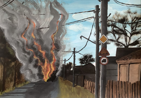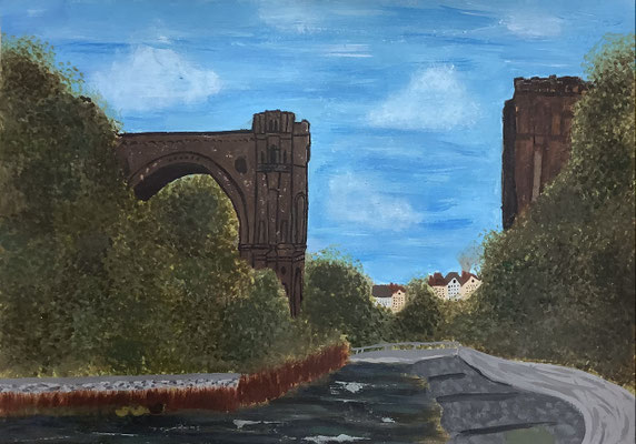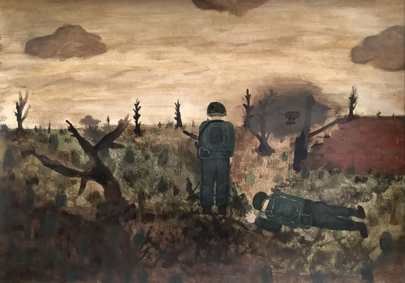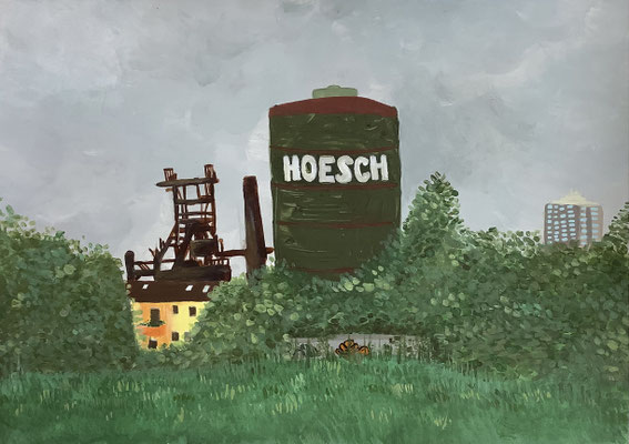 Die Schülerinnen und Schüler der beiden Kunst-Kurse der Einführungsphase von Frau Feuler haben sich mit dem Oberthema „Landschaftsmalerei“ beschäftigt. Die Malereien zeigen einerseits die Nahperspektive der persönlichen Erlebniswirklichkeit und eröffnen andererseits die Perspektive, wie verletzlich das eigene, scheinbar sichere Umfeld, durch Bedrohungen wie Krieg und Krisen sein kann.