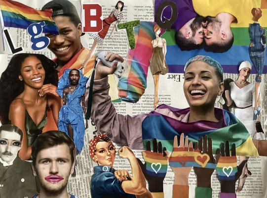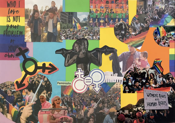 Im Kunstunterricht der Jahrgangsstufe 9 von Frau Feuler wurden Collagen erstellt, die sich mit Geschlechterfragen und vielfältigen Identitäten auseinandersetzen. Zu sehen sind ein paar Beispiele.