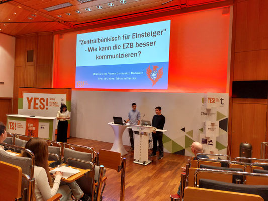 Am 12.6.2025 nahmen Finn, Malte, Yannick (10b) und Jan und Tobia EF) am YES! - Regionalfinale in Essen im Haus der Technik teil. Das Team beschäftigte sich zuvor wochenlang mit der Projektfrage: „Talk to me: Wie kann die EZB besser kommunizieren?“. Bei dem Regionalfinale präsentierten sie ihren Lösungsvorschlag „Zentralbänkisch für Anfänger – Zentralbankkommunikation auf Augenhöhe“. Das Team entwickelte einen EZB-Simulator als spielerischen Ansatz in Form eines Onlinegames, welches konkret für den Unterricht entwickelt wurde. Schüler:innen übernehmen darin die Rolle der Zentralbank und reagieren auf wirtschaftliche Ereignisse wie z.B. eine Pandemie, um die Inflation bei zwei Prozent zu halten. Ein integriertes Feedbacksystem zeigt unmittelbar die Folgen der Spielentscheidung. Leider hat das Team bei diesem Regionalfinale nicht den ersten Platz belegt, gemeinsam traten sie gegen sieben weitere Projektgruppen an. Dennoch war der Tag sehr interessant und die Truppe vom Phoenix-Gymnasium hat eine sehr gute Präsentation gehalten und ganz am Ende gelungen gepitcht. Es war mir eine große Freude, das Team zu begleiten und sicherlich werde ich das Onlinegame für den Sowi-Unterricht nutzen.