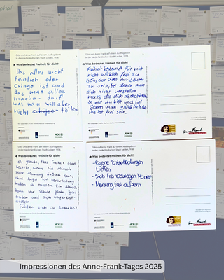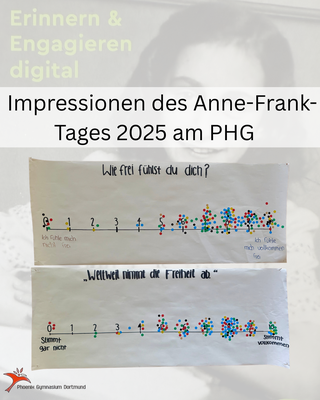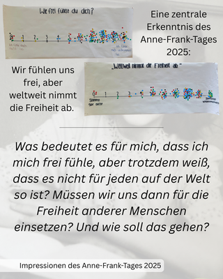 Was bedeutet Freiheit für mich und wofür möchte ich mich einsetzen? Hier gibt es einen Einblick in Eure Antworten am diesjährigen Anne-Frank-Tag! Im Anschluss bleiben offene Fragen: Was bedeutet es für mich, dass ich mich frei fühle, aber trotzdem weiß, dass es nicht für jeden auf der Welt so ist? Müssen wir uns dann für die Freiheit anderer Menschen einsetzen? Und wie soll das gehen? Was meint Ihr? Schreibt es uns in die Kommentare! Ein großes Dankeschön an die Courage-AG mit Herrn Malesevic und Frau Bandermann für das Organisieren!