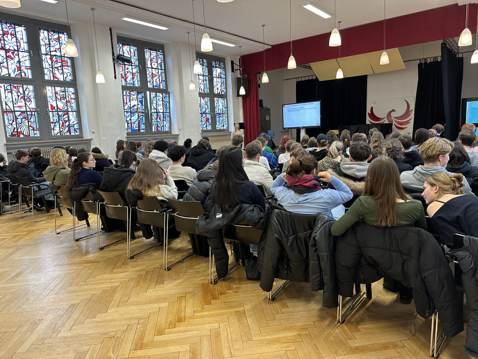 Für unsere Q2 hat mit dem Jahreswechsel der Endspurt begonnen und die Abiturprüfungen nahen. Doch was kommt eigentlich danach? Wie soll es weitergehen? Um hier etwas Klarheit zu erlangen, fand heute die Infoveranstaltung „Wege nach dem Abitur“ in unserer Aula statt. Frau Fantoly von der Arbeitsagentur hat die grenzenlose Freiheit nach dem Abitur strukturiert und die verschiedenen Möglichkeiten aufgezeigt: Studium, Ausbildung, duales Studium… Oder doch erstmal ein Überbrückungsjahr? Was verdient man eigentlich als Azubi? Und wo liegt der Vorteil eines dualen Studiums? Welchen NC braucht man überhaupt? Angereichert durch viele Beispiele und Ideen sind nun hoffentlich für unsere Q2er neue Horizonte eröffnet worden und alle Fristen, Bewerbungsvoraussetzungen und Co sind nun bekannt… jetzt muss „nur noch“ das Abitur geschafft werden ;-).