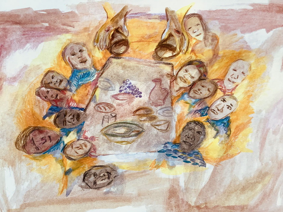 Im Christentum wird die Zeit vor Ostern traditionell als Passionszeit bezeichnet. Passend dazu hat sich unsere Schülerin Frieda Meinert aus der Jahrgangsstufe 9 im Unterricht bei Frau Feuler mit einem Ausschnitt aus dem Hungertuch des Künstlers und Theologen Sieger Köder auseinandergesetzt und die Thematik für sich neu interpretiert: